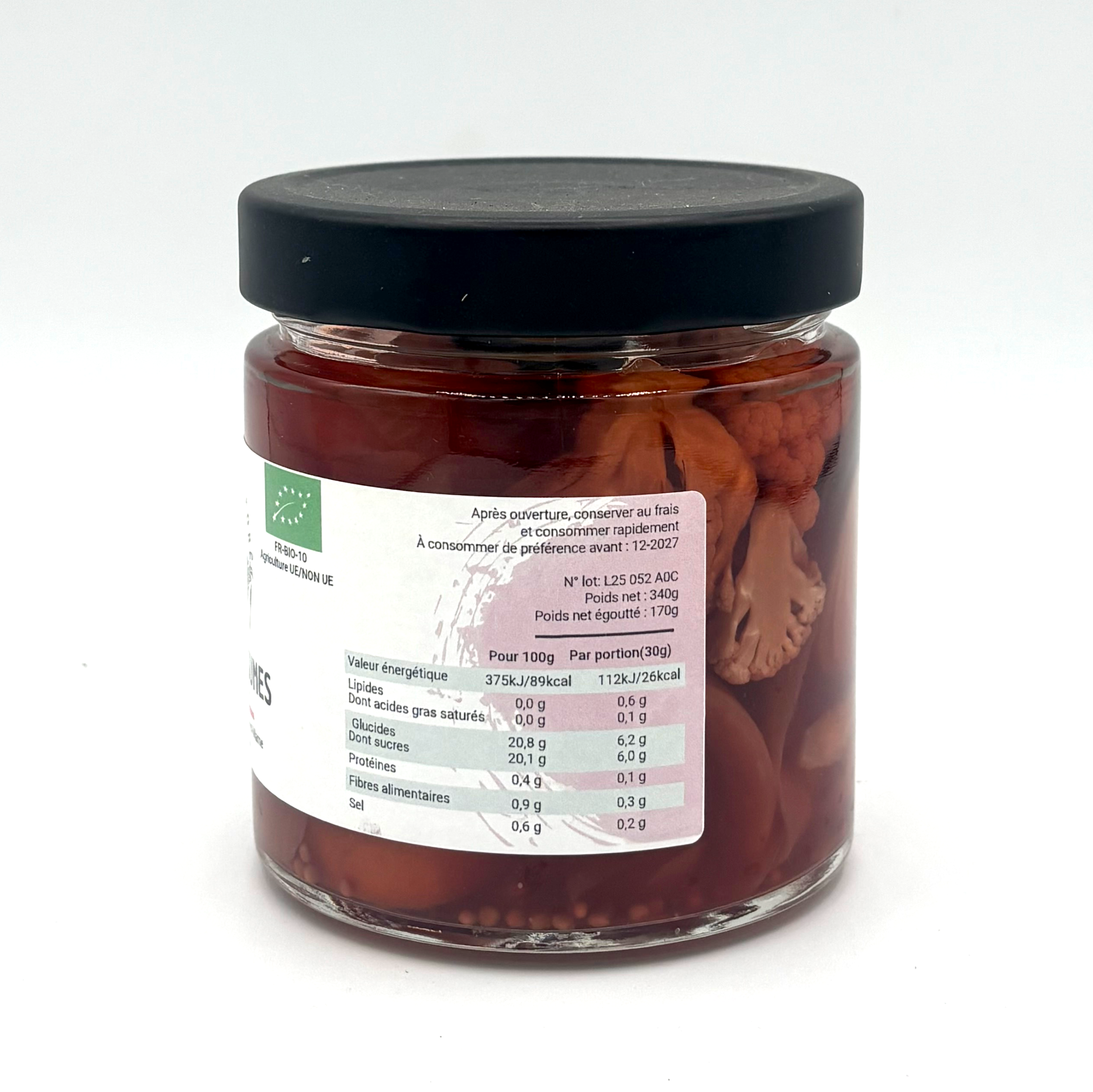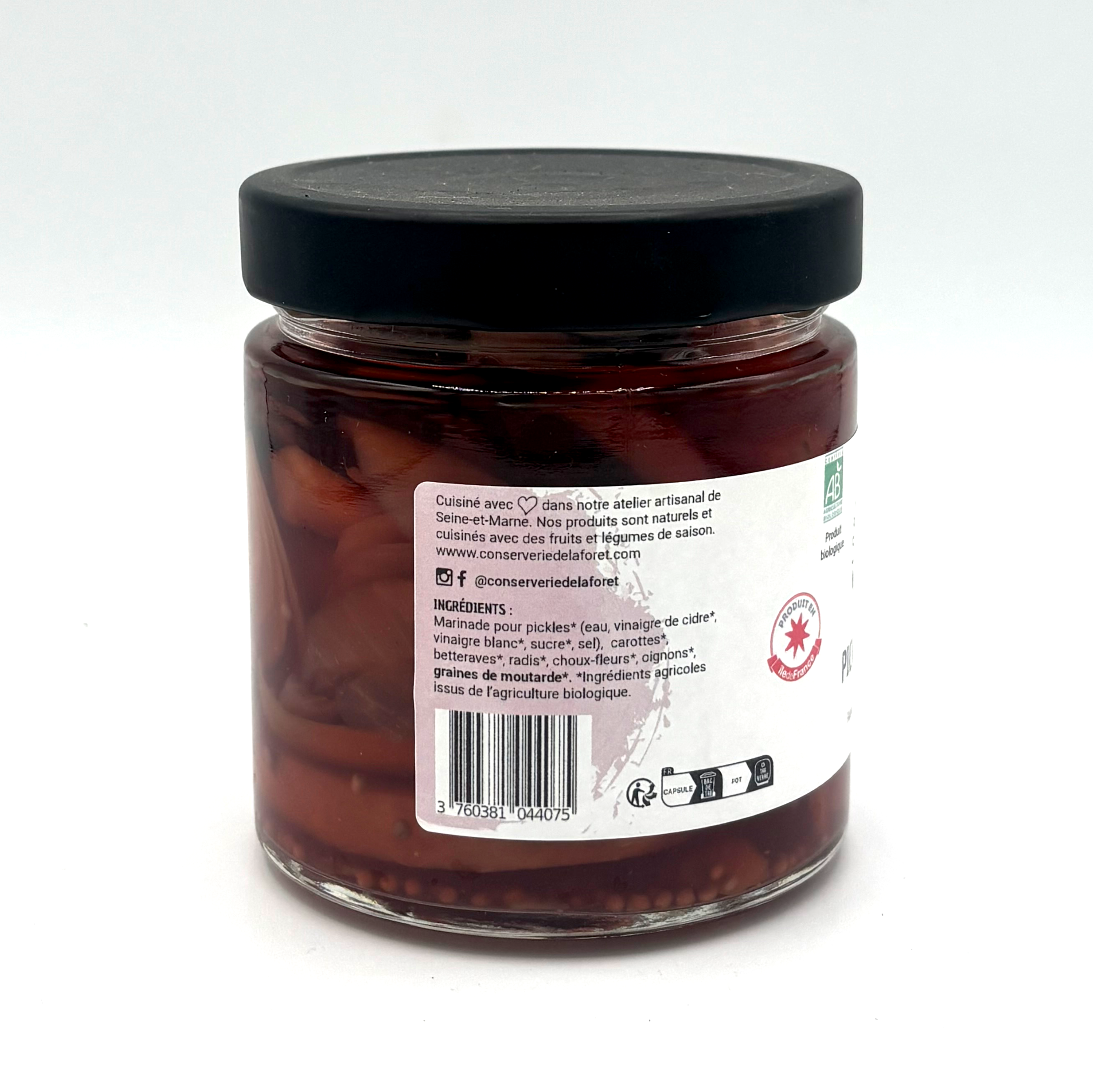 Découvrez les légumes sous un nouvel angle avec les pickles ! Carottes, oignons, radis, choux-fleurs et radis japonais sont conservés dans un mélange de vinaigre et de sucre de canne afin de sublimer leurs saveurs et agrémenter vos plats. La marinade de nos pickles tient son originalité de l’utilisation du vinaigre de cidre, qui l’adoucit et lui confère une subtile saveur de pomme.